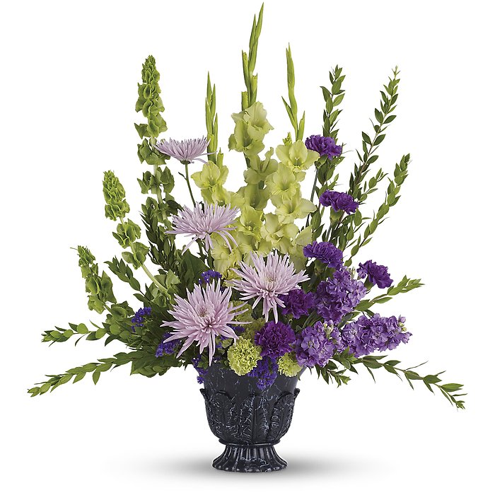 An ideal choice for home or service, this stunning bouquet featuring green gladioli and lavender stock will express your sympathy lovingly and tastefully.